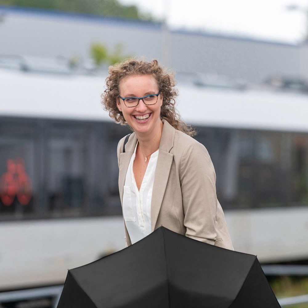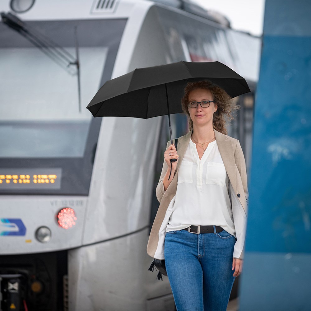 Preislich attraktiver Handöffner-Taschenschirm Einfache Handhabung durch Sicherheitsschieber, Windproof-System für höhere Gestell-Flexibilität und bessere Windsicherheit, Soft-Touch-Griff mit elastischer Tragekordel und Werbeanbringungsmöglichkeit