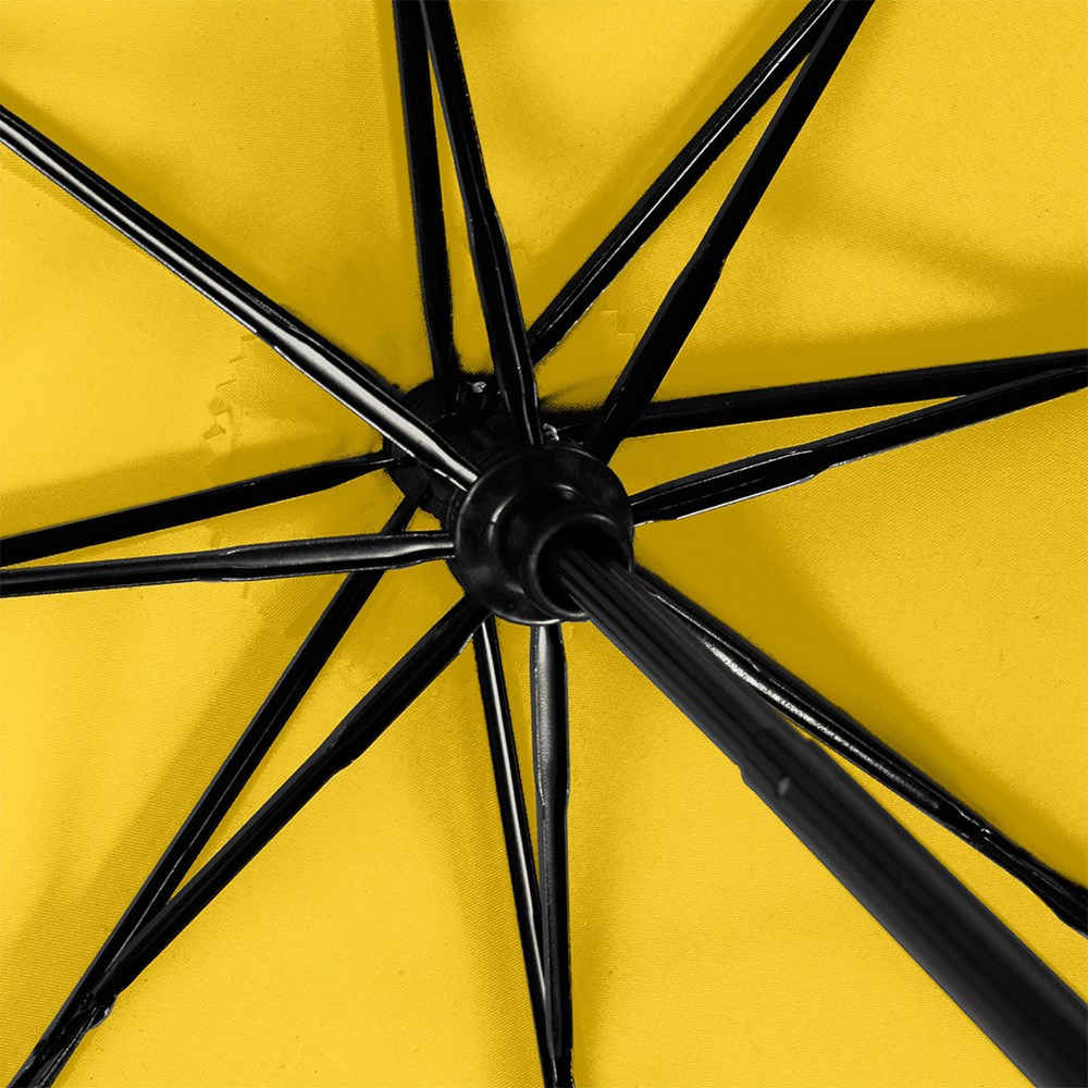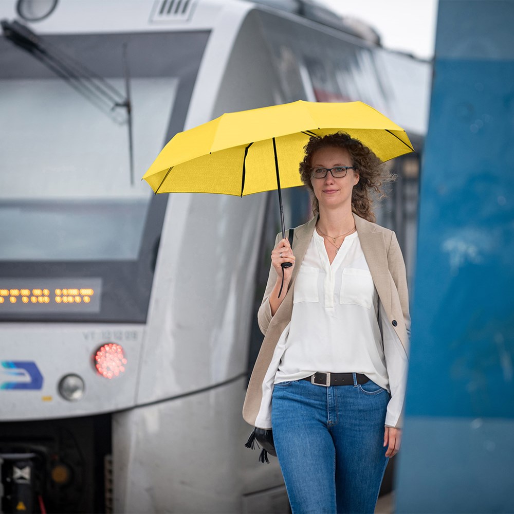 Preislich attraktiver Handöffner-Taschenschirm Einfache Handhabung durch Sicherheitsschieber, Windproof-System für höhere Gestell-Flexibilität und bessere Windsicherheit, Soft-Touch-Griff mit elastischer Tragekordel und Werbeanbringungsmöglichkeit