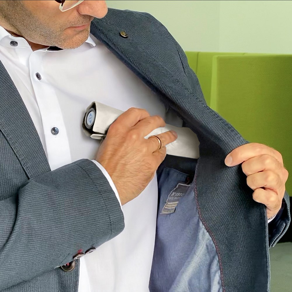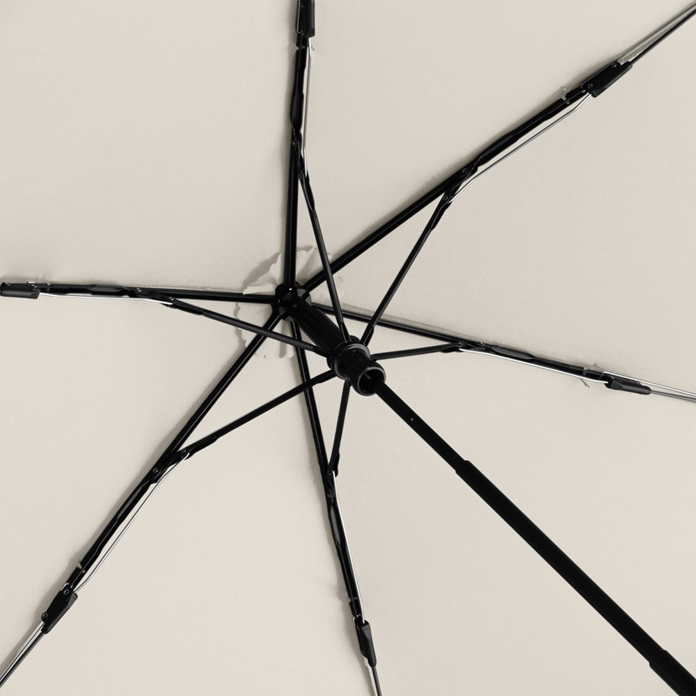 Filigraner Handöffner-Taschenschirm in ultraleichter Ausführung Einfache Handhabung durch Sicherheitsschieber, hochwertiges Windproof-PLUS-System für eine maximale Gestell-Flexibilität bei stärkeren Windböen, schwarzer Aluminiumstock, Polyester-Pongee Bezugsmaterial aus recycelten Kunststoffen, extra leichter Bezug, matt-schwarzer Kunststoffgriff aus recyceltem ABS (rABS) mit Werbeanbringungsmöglichkeit, handtaschentauglich durch ultraleichtes Gewicht und kompakte Größe