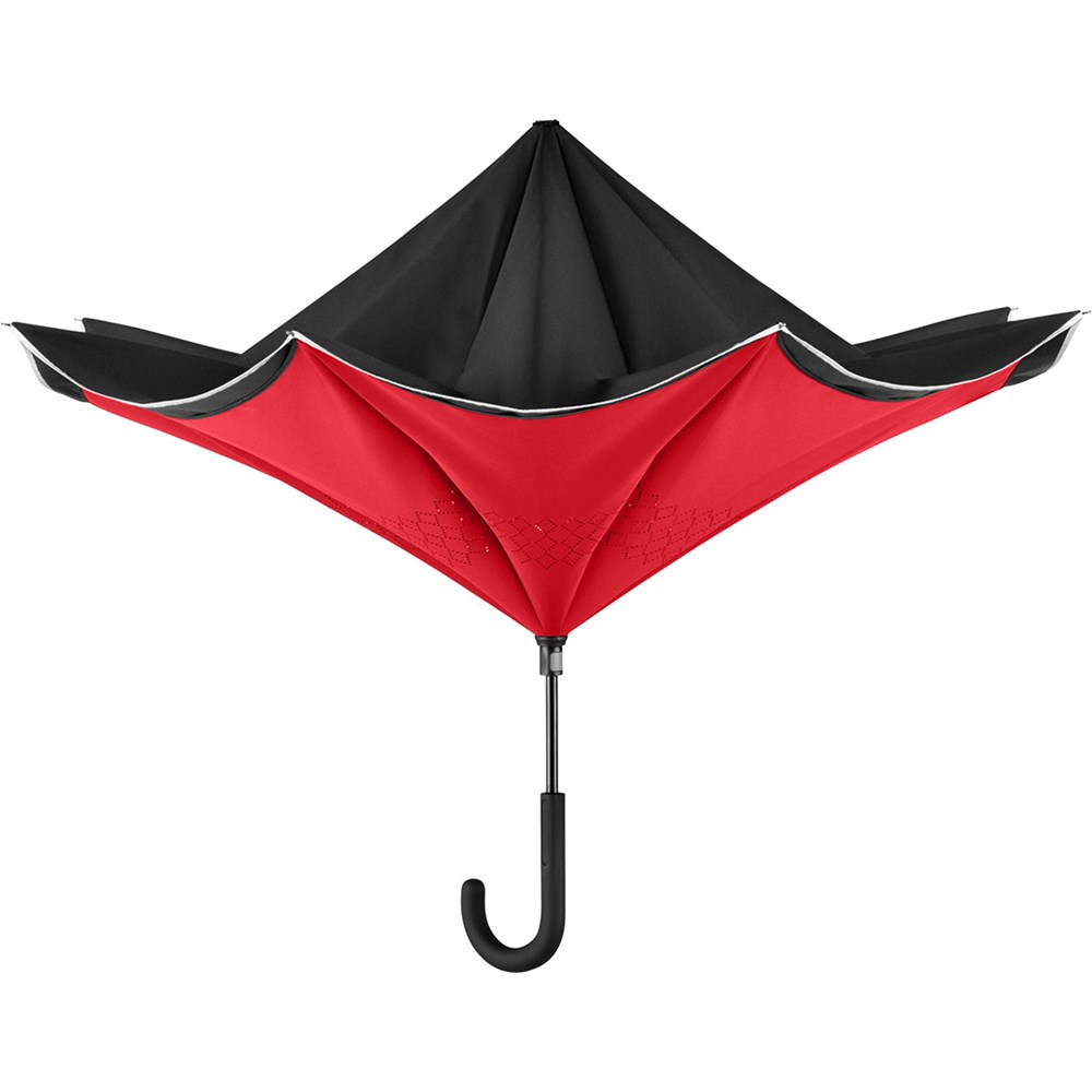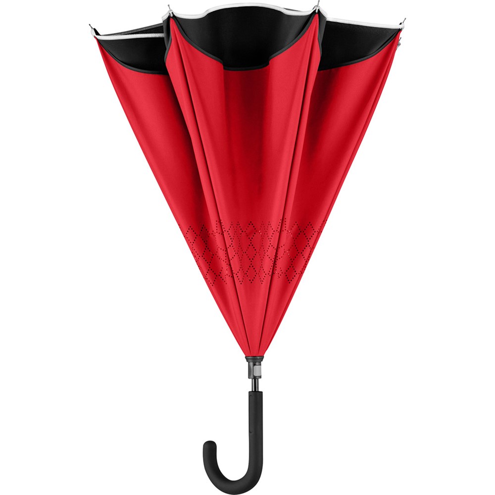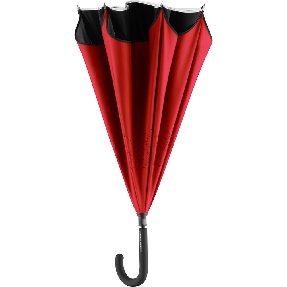 Trendiger Stockschirm mit umgekehrtem Öffnungs- und Schließmechanismus Einfache Handhabung durch Sicherheitsschieber, hochwertiges Windproof-PLUS-System für eine maximale Gestell-Flexibilität bei stärkeren Windböen, von innen nach außen öffnendes Fiberglasgestell, flexible Fiberglasschienen, Doppel-Bezug mit gelasertem Ventilationsmuster zur Vermeidung von Luftstau, Bezug mit modischer Reflexpaspel in Silber, Soft-Touch-Rundhakengriff mit Werbeanbringungsmöglichkeit. Auch als Taschenschirm erhältlich (Art. 5415).