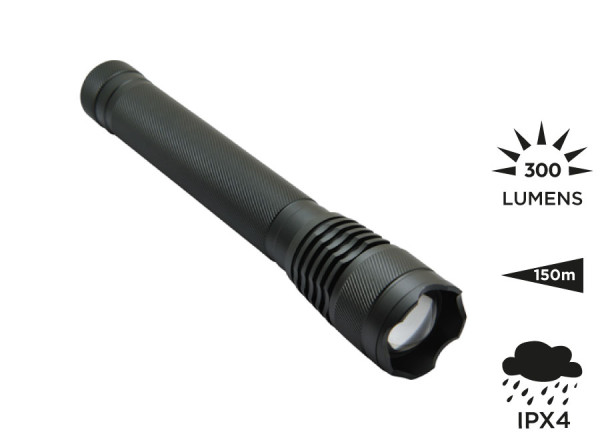 Griff aus eloxiertem Aluminium. 5-Watt-LED CREE XPE. Beleuchtungsmodi (100%, 30% oder blinkend). Fokussiersystem zur Erhöhung der maximalen Beleuchtungsreichweite durch Bündelung des Lichtstrahls. Dichtungen an jedem Gewinde für bessere Wasserdichtigkeit (nicht eintauchen). Ein- / Ausschaltknopf am Lampenende. Funktioniert mit 3 LR14 C-Batterien (nicht im Lieferumfang enthalten). LED-Leistung: 5W (300 Lumens). Strahllänge: 150m. Wasserbeständigkeitsniveau: IPX-4. Wird in einer Geschenkbox geliefert.