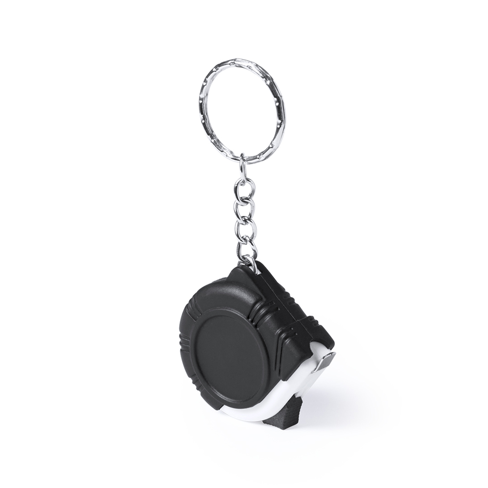 Schlüsselanhänger mit 1 m langem Metallmaßband mit Verriegelungsmechanismus. Maßangabe in Zentimeter, Zoll und Fuß. Mit spezieller Stanzung zum Bedrucken.