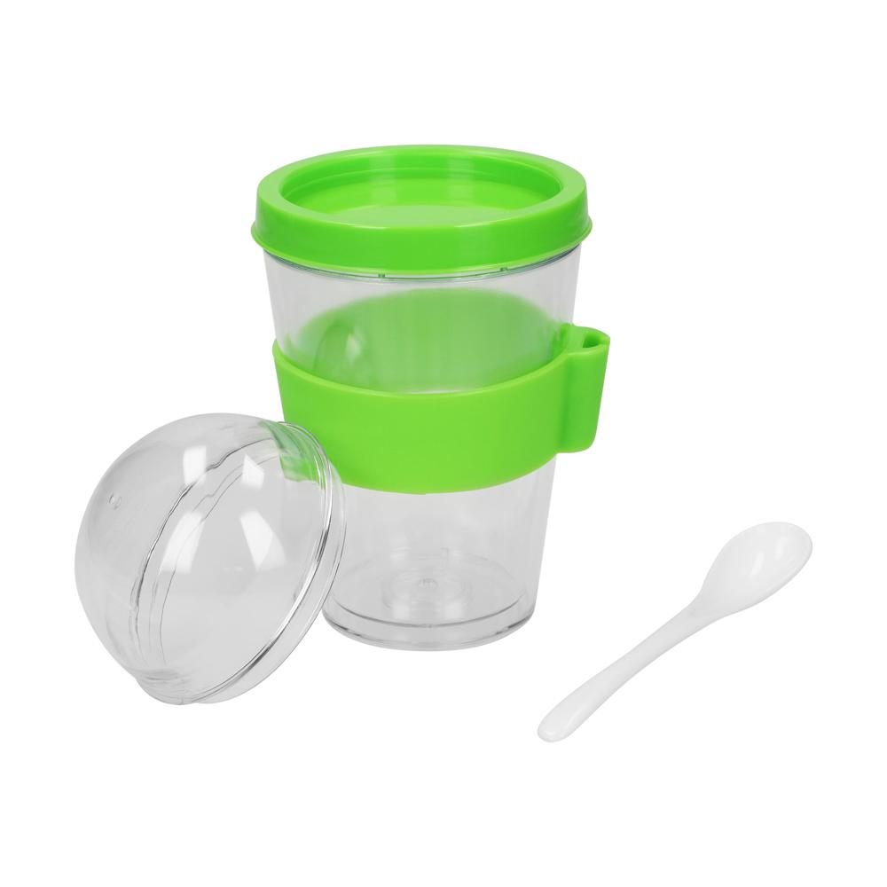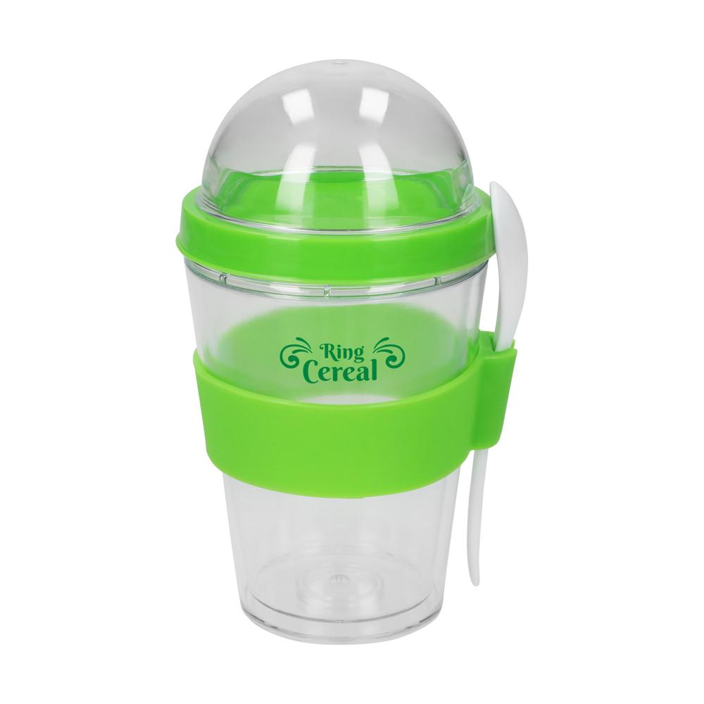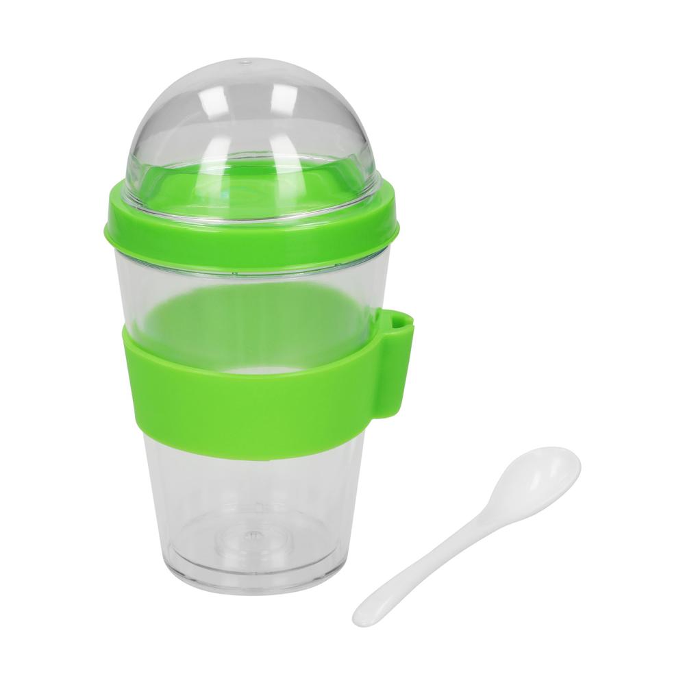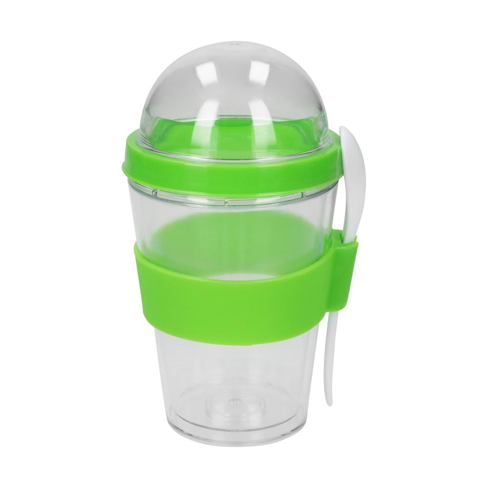 Der perfekte Frühstücksbecher. Doppelwandiger, transparenter Kunststoffbehälter mit extra befüllbarem Deckel. Ideal um Joghurt oder Milch und das entsprechende Müsli oder andere Zutaten separat zu transportieren. Der beiliegende Kunststoff-Löffel findet seinen Platz im Halter an der Silikon-Manschette.