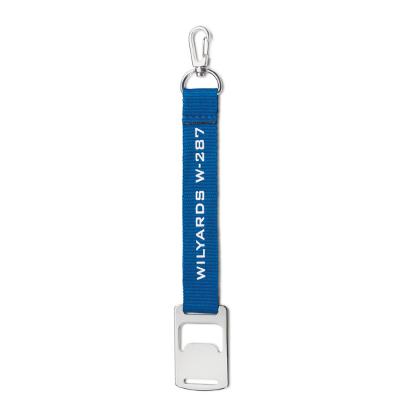 Ausstattung: Karabiner A-203 silber glänzend, Flaschenöffner B-120 silber glänzend, Farbe des Bandes ähnlich Pantone möglich